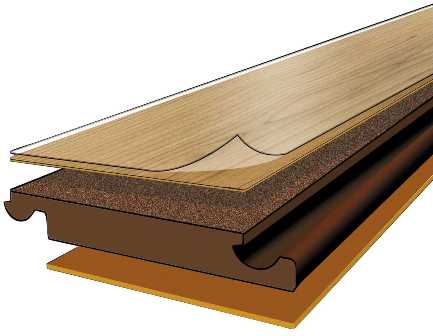 Слово "ламинированный" означает слоистый. Действительно, ламинат состоит из нескольких слоёв. Самый верхний слой - это специальная защитная плёнка, которая и является гарантом предохранения от внешних воздействий. Под этим слоем находится декоративная доска, на которую нанесён рисунок. Третий слой - это основная несущая часть конструкции; представляет собой очень плотную плиту, способную выдержать давление и большие нагрузки. Последний слой является стабилизирующим - он придаёт устойчивости и целостности всей конструкции. Для повышения влагоустойчивости и звукоизоляции могут присутствовать дополнительные слои.